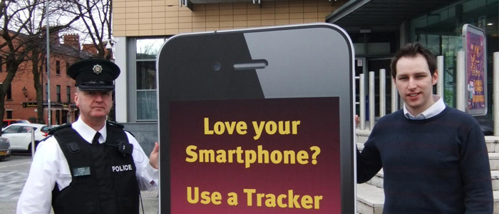 Inspector Ray Shaw and Connor Daly, Student Officer Campaigns & Communications, Queen's Students Union, encourage people to use a Tracker App to keep their smartphone safe.